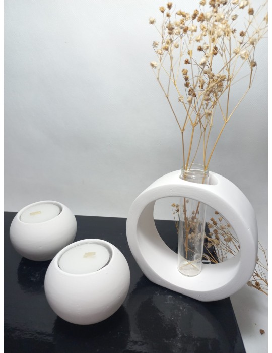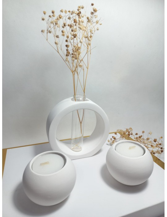 Görselde paylaştığınız bu zarif parçalar, koleksiyonunuzun minimal ve modern ruhunu yansıtan 3'lü Dekoratif Set (Cam Tüplü Vazo & 2 Adet Küre Mumluk) olarak öne çıkıyor. Beyazın saf dokusu ve geometrik formların uyumu, her türlü dekorasyon stilinde odak noktası oluşturacak nitelikte.