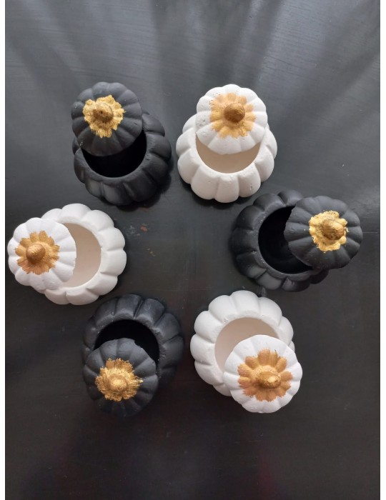 Bu set, farklı form ve boyuttaki bal kabağı biblolarından oluşur. Siyah ve beyazın net kontrastı sayesinde, setiniz masanızda, konsolunuzda veya şömine rafınızda anında göz alıcı bir odak noktası oluşturur.